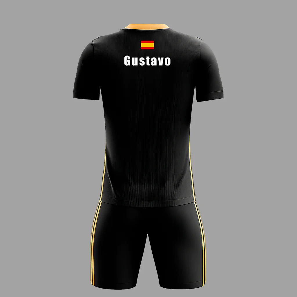 Sal a la pista con fuerza y elegancia con este conjunto de pádel negro y amarillo. Su diseño con líneas doradas y cuello en V transmite potencia y estilo, mientras su tejido técnico transpirable garantiza el máximo confort en cada partido.